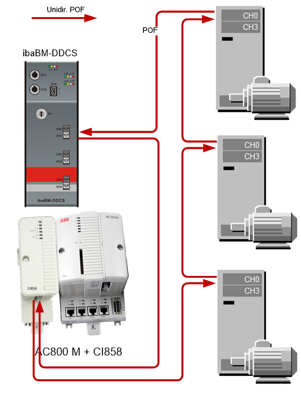 The ibaBM-DDCS device is coupled into the ring between the last drive and the controller.