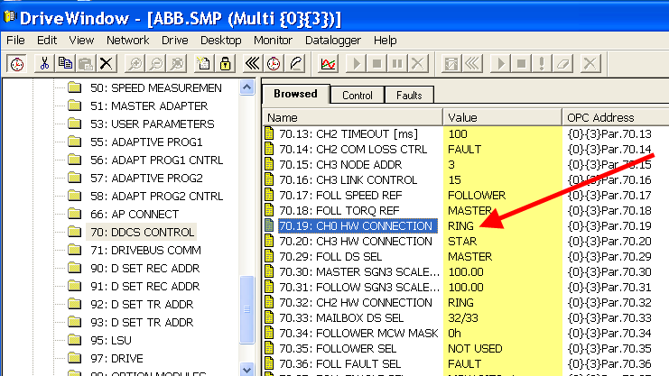 When acquiring data sets in a ring topology, ensure that the connected drives are set to “Ring” topology. In DriveWindow, the parameter “CH0 HW CONNECTION” in the parameter set “DDCS Control” of each drive has to be checked and set to “RING”.