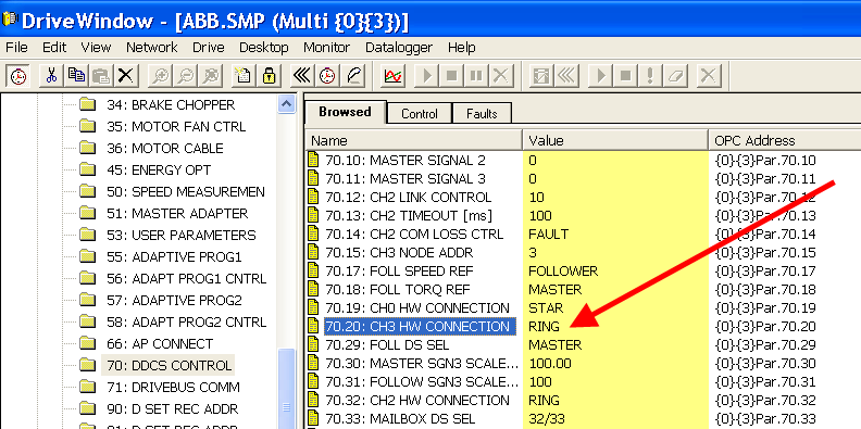 When acquiring parameter in a ring topology, ensure that the connected drives are set to “Ring” topology. In DriveWindow, the parameter “CH3 HW CONNECTION” in the parameter set “DDCS Control” of each drive has to be checked and set to “RING”.