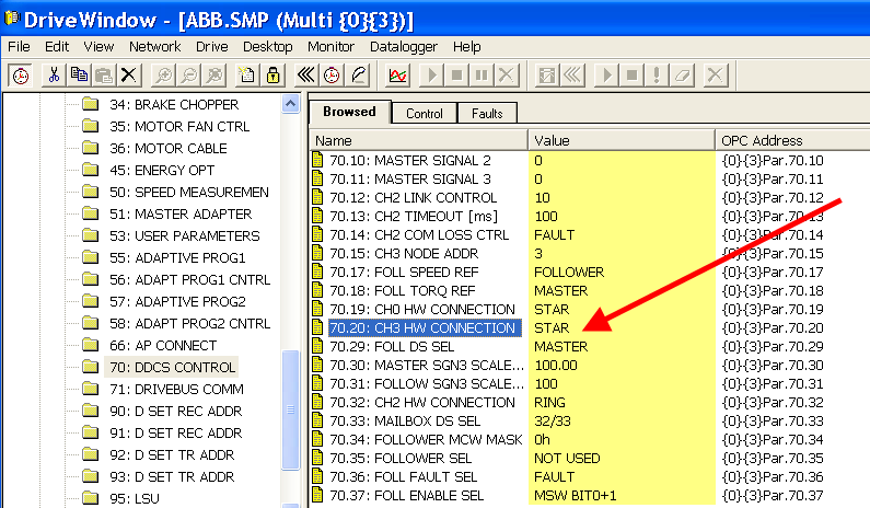 When acquiring parameter in a star topology, ensure that the connected drives are set to “Star” mode. In DriveWindow, the parameter “CH3 HW CONNECTION” in the parameter set “DDCS Control” of each drive has to be checked and set to “STAR”.
