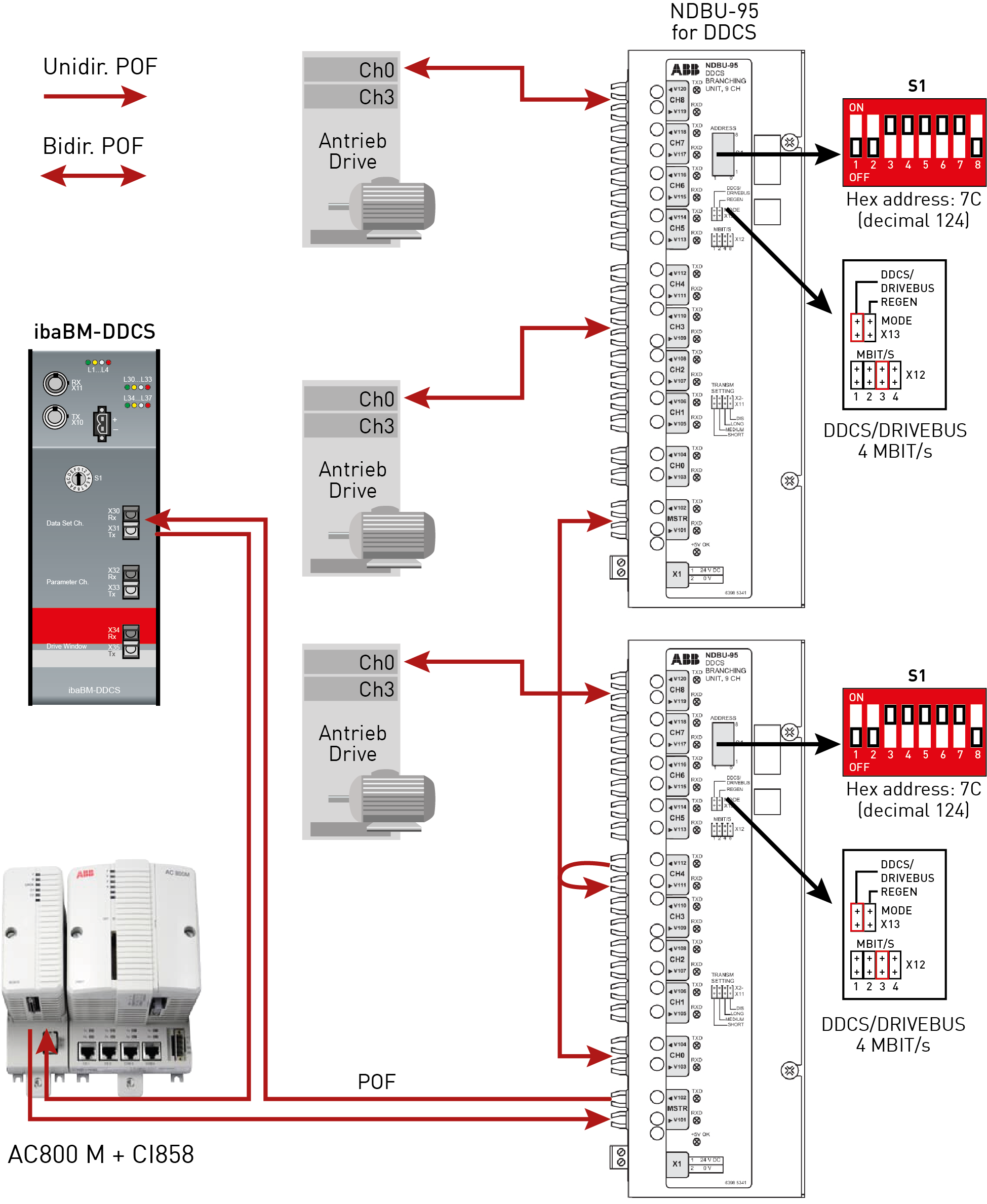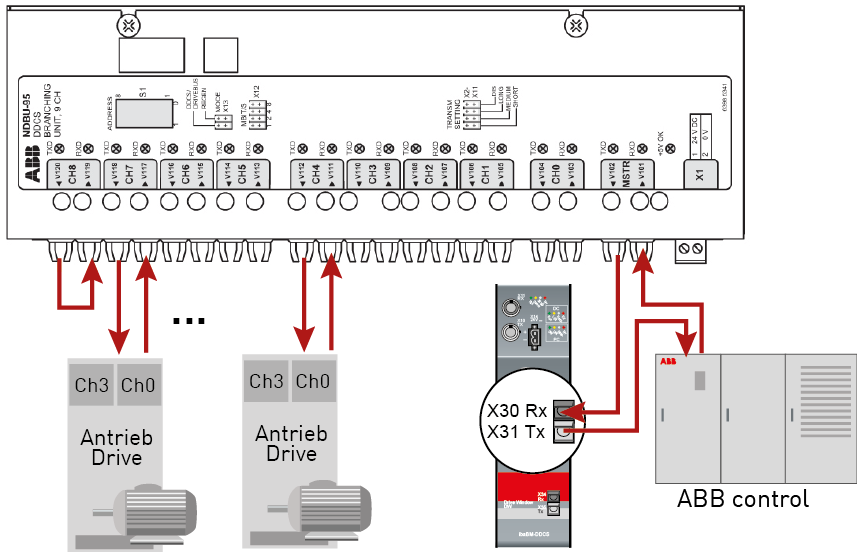 One or more NDBU-95 devices (DDCS branching unit) are used to distribute the DDCS telegrams. 8 drives can be connected to each NDBU-95. Up to 16 NDBU-95 devices can be cascaded.