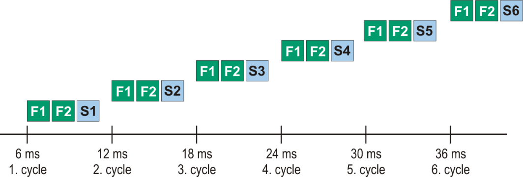 8 analog parameter values are captured in total: 2 values which are set to “Fast” and 6 slow values. The 2 fast values and 1 slow value are sent with each cycle, in total 3 values. Hence, one cycle takes 6 ms.