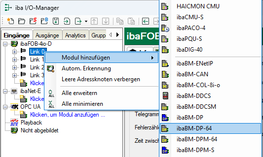 Fügen Sie in ibaPDA I/O-Manager am Link der entsprechenden ibaFOB-Karte ein Modul "ibaBM-DP-64" hinzu.