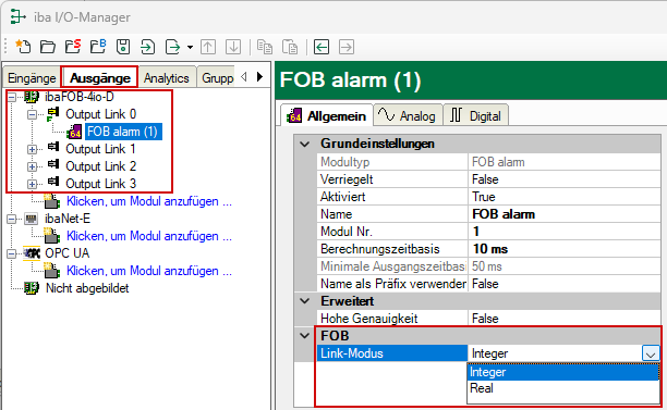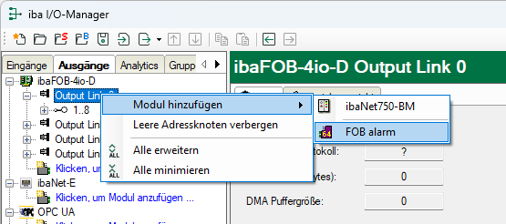 Fügen Sie im Bereich Ausgänge im I/O-Manager am entsprechenden Ausgangslink ein "FOB alarm"-Modul hinzu.