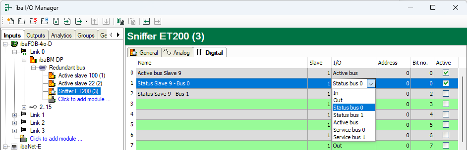 The additional I/O type "Active bus" for the digital signals provides you with information about the bus via which the signals of a specific slave are currently being recorded by ibaBM-DP.