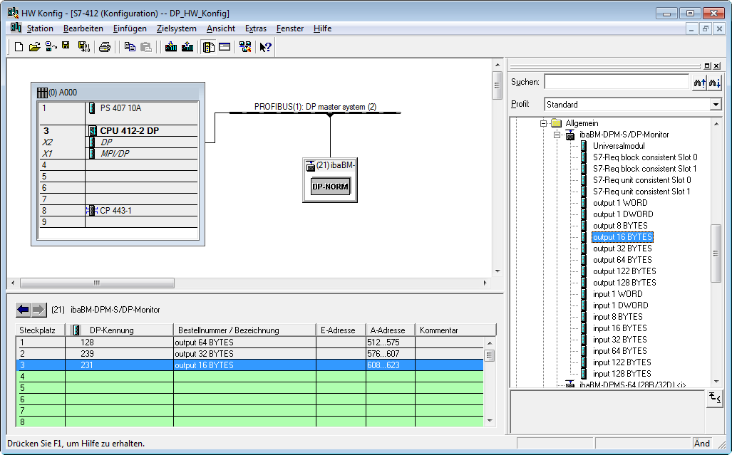 Importieren Sie die GSD-Datei im Tool "HW Konfig" unter Step7. Im Katalog der verfügbaren Baugruppen finden Sie nun unter Profibus DP – Weitere Feldgeräte – Allgemein das Gerät "ibaBM-DPM-S/DP-Monitor".