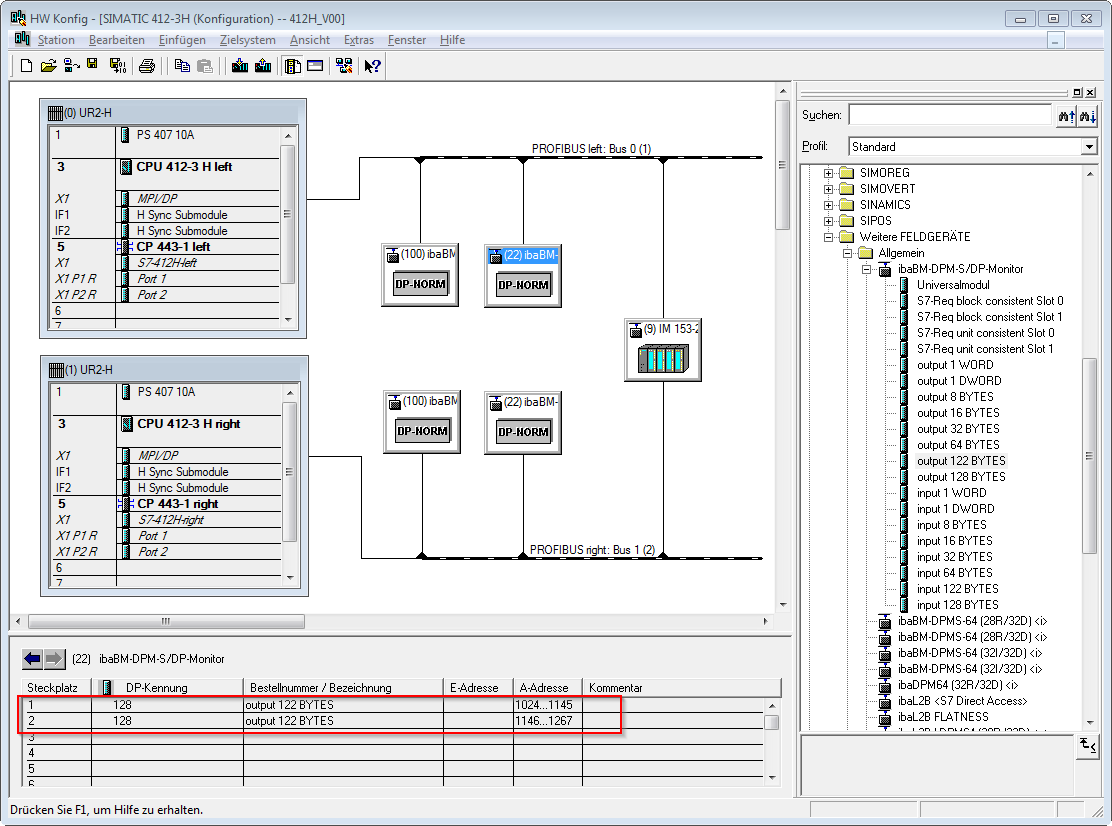 Wenn Sie interne Daten der S7-400H an einen aktiven Slave von ibaBM-DP senden wollen, müssen Sie die aktiven Slaves in der Hardware Konfiguration der S7-400H unter SIMATIC Step7 projektieren.