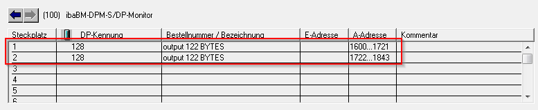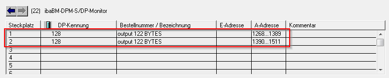In der obigen Abbildung wurden zwei aktive Slaves (Adressen 22 und 100) projektiert. Folgende Adressbereiche wurden vergeben: