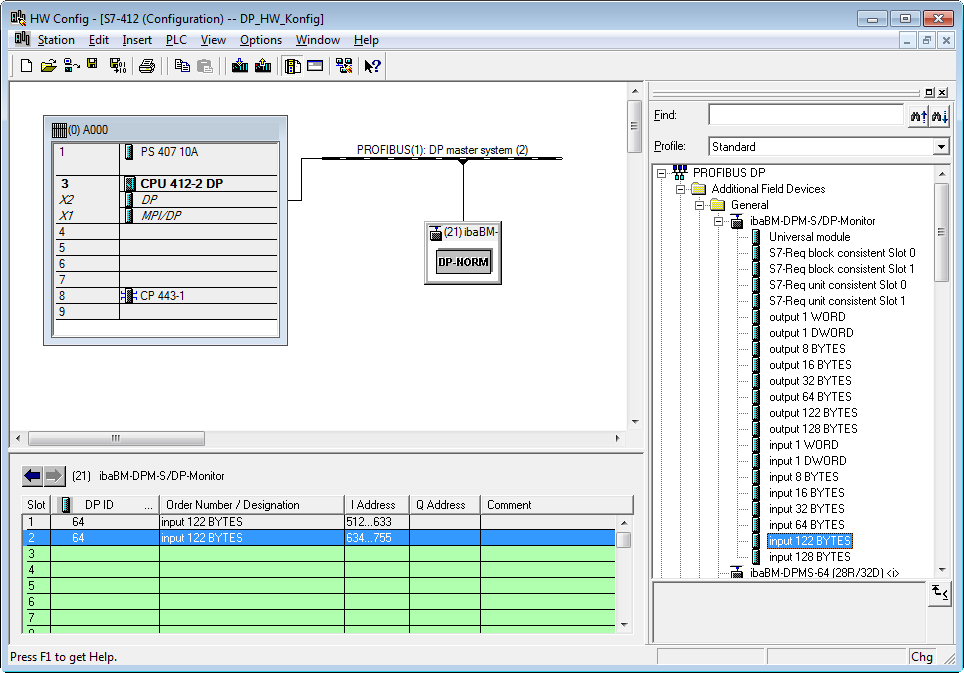 In the following example, a total of 244 bytes of input data have been configured with 2 slot modules with a length of 122 bytes each for slave 21.