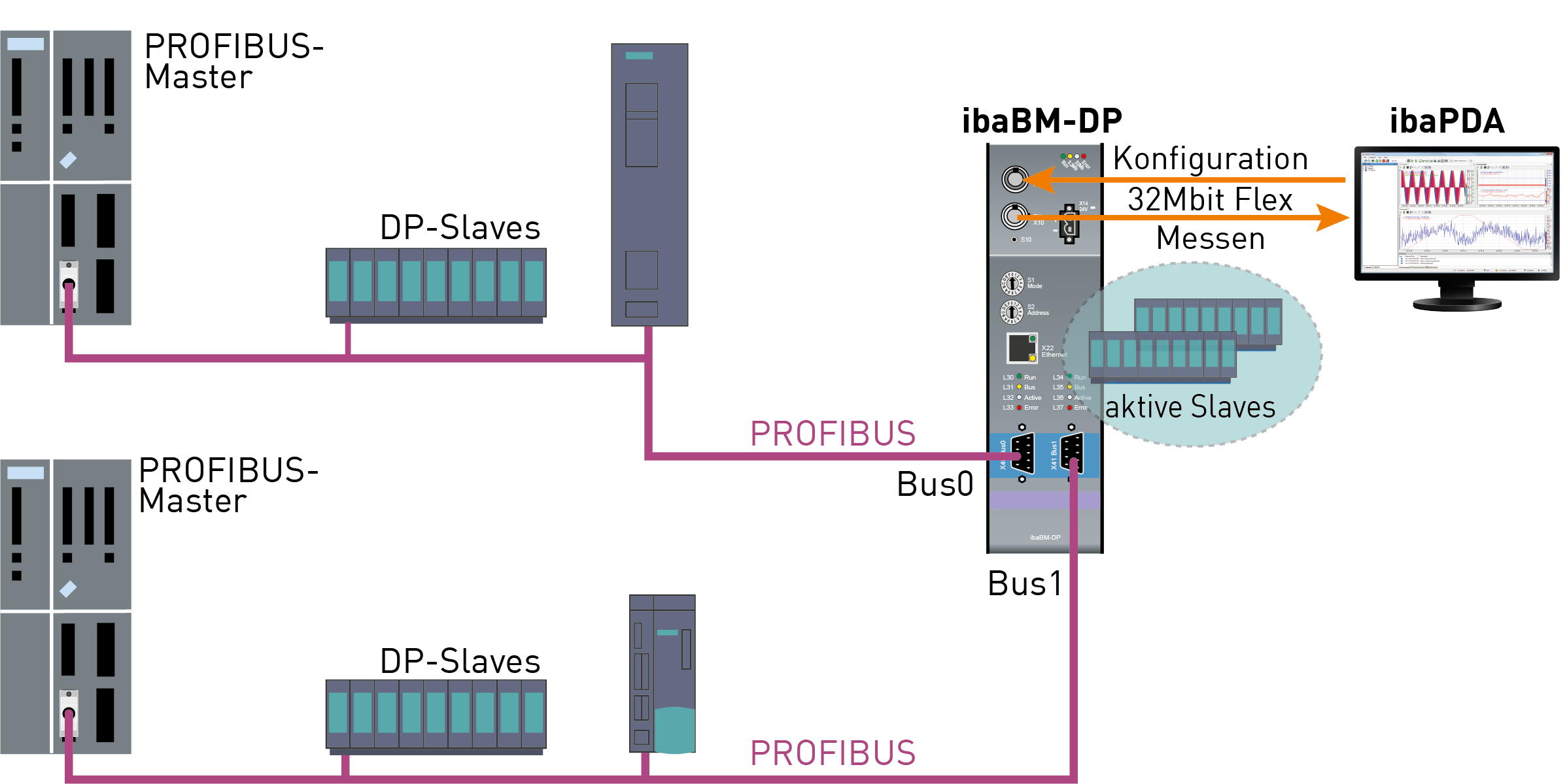 Gleichzeitig können im Gerät aktive Slaves konfiguriert werden, die dann gezielt vom Master mit Daten versorgt werden können. Dazu muss das Gerät über die GSD-Datei in der Konfiguration des DP-Masters enthalten sein. Die Slaves (bis zu 8) können beliebig auf beide DP-Stränge verteilt werden.