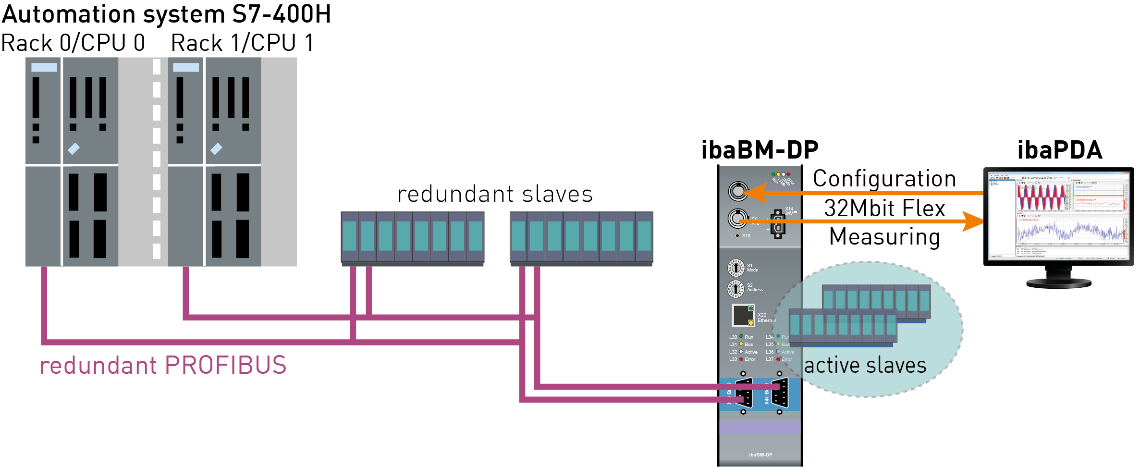 Identical to the system setup with non-redundant PROFIBUS, the device configuration and the recorded data are exchanged with ibaPDA via a bidirectional fiber optic connection.