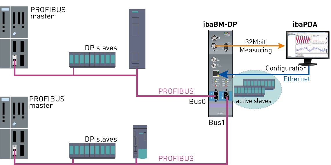 If the device is operated in compatibility mode 32Mbit, only a unidirectional connection is needed for acquiring the data in the ibaPDA system. The configuration data is transmitted over an Ethernet connection.