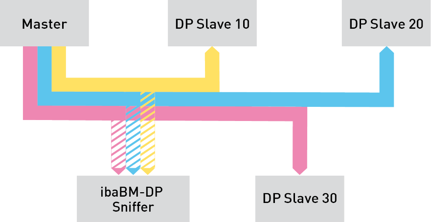 Due to the sniffer function, ibaBM-DP can read all data sent on PROFIBUS DP (cyclical data exchange according to DP-V0). The device only needs to be connected to the PROFIBUS. The device does not need to be configured as a PROFIBUS slave in order to use the sniffer function.