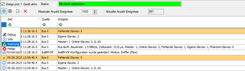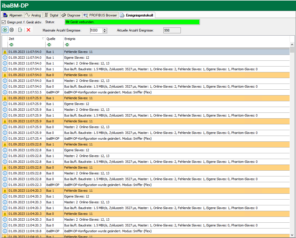 Im Ereignisprotokoll werden in Listenform von ibaBM-DP erkannte Zustandsänderungen am PROFIBUS dokumentiert. Das Ereignisprotokoll findet sich im I/O-Manager: Markieren Sie das Gerät ibaBM-DP im Schnittstellenbaum. Auf der rechten Seite finden Sie nun das Register "Ereignisprotokoll".