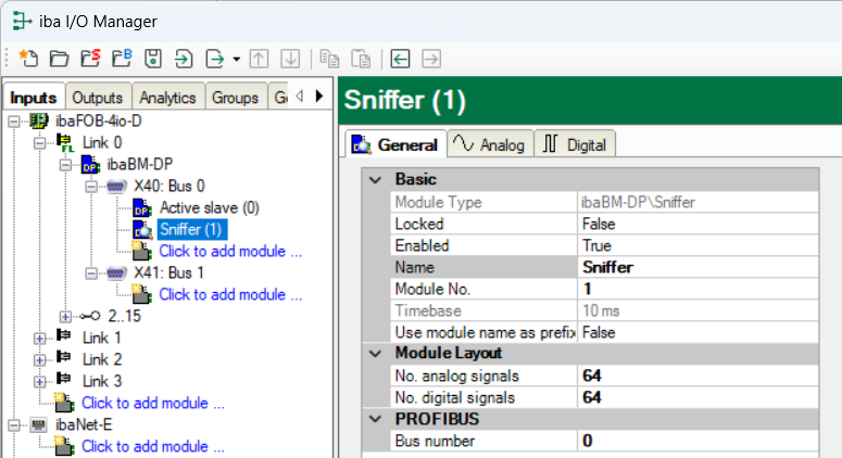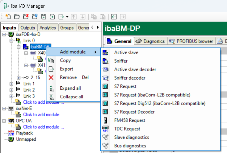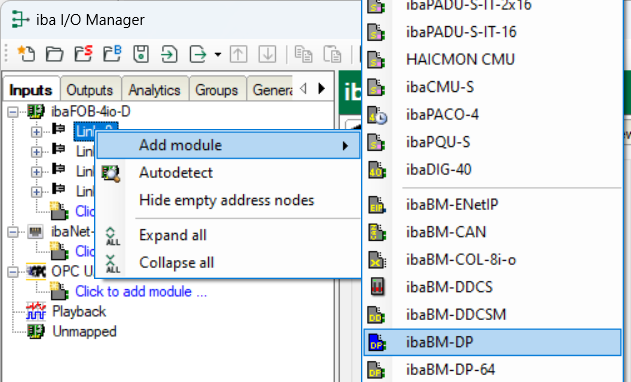 Add a module under the “ibaBM-DP” device module. To do this, right-click on the “ibaBM-DP” device module and select in the desired module from the list via Add module from the context menu.