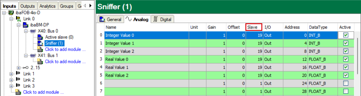 The signals on the Analog and Digital tab are configured as for the "Active slave" module. In the Slave column, enter the slave number the data is to be captured from.
