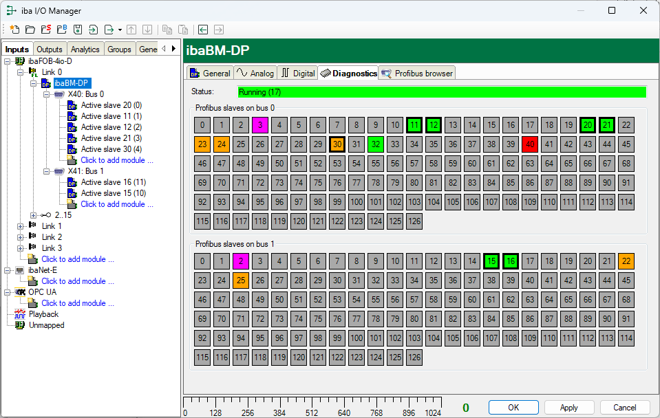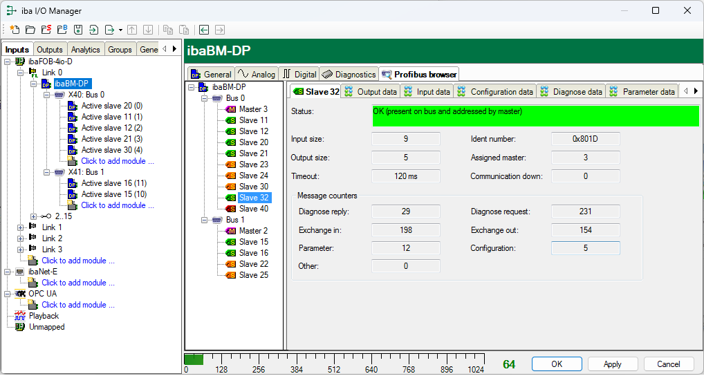 ibaBM-DP provides a wide variety of diagnostic features for PROFIBUS systems. The Diagnostics tab in the device module is very helpful. On this tab, the identified masters and slaves and their status are shown for both PROFIBUS systems.