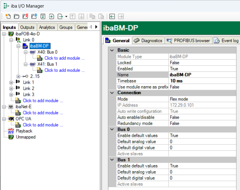 By means of the following instruction, you learn how to integrate ibaBM-DP step by step into ibaPDA and how to configure measurement signals. The description refers to the 32Mbit Flex mode, see chapters Device setting 32Mbit Flex mode and Data acquisition 32Mbit Flex.