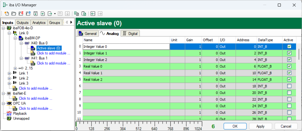 In the Analog tab, enter the signals you want to acquire in sequential order. Assign a name to each signal (Name column). In the I/O, Address and Data type column, define the information where the signal can be found in the interface of the slave.