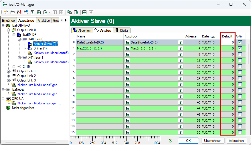 Die Default-Werte können bei den Ausgängen individuell für jedes einzelne Signal eingestellt werden. Bei der Einstellung TRUE wird eine zusätzliche Spalte Default bei den Analog- und Digitalsignalen eingeblendet.