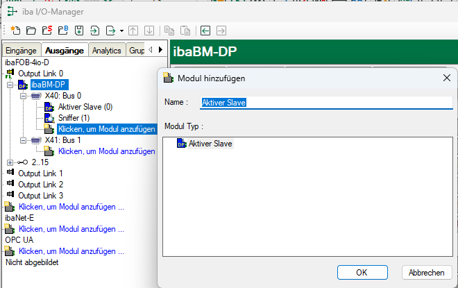 Ein neues Modul vom Typ "Aktiver Slave" projektieren Sie durch Tippen auf den blau hinterlegten Befehl "Klicken, um Modul anzufügen…". In der Dialogbox ist nur das Modul vom Typ "Aktiver Slave" vorhanden. Fügen Sie das Modul mit <OK> hinzu.