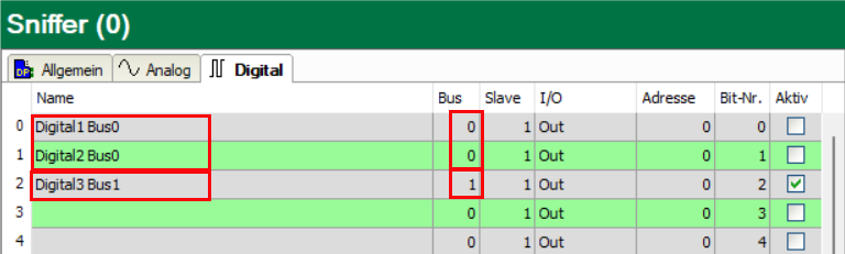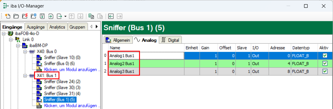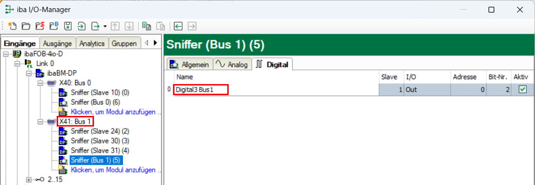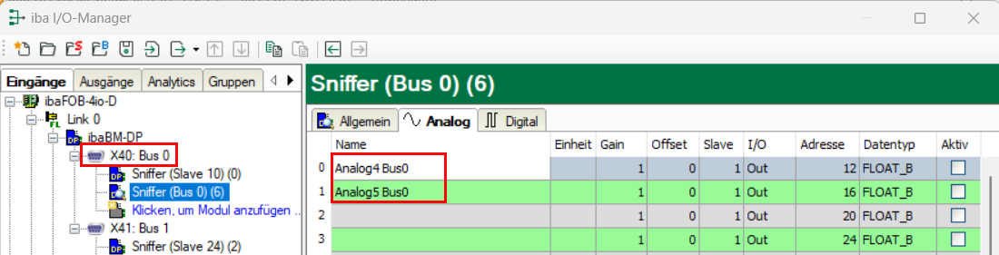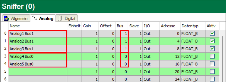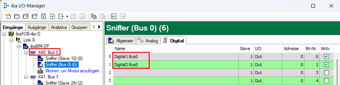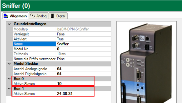 Unter dem "ibaBM-DPM-S"-Modul ist ein Sniffermodul konfiguriert. Im Register Allgemein sind auf Bus 0 und Bus 1 jeweils aktive Slaves konfiguriert. In den Registern Analog und Digital sind jeweils Signale auf Bus 0 und Bus 1 vorhanden.