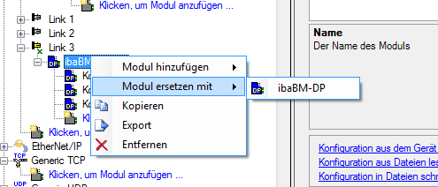 Klicken Sie mit der rechten Maustaste auf das vorhandene Gerätemodul "ibaBM-DPM-S" und wählen Modul ersetzen mit ibaBM-DP aus.