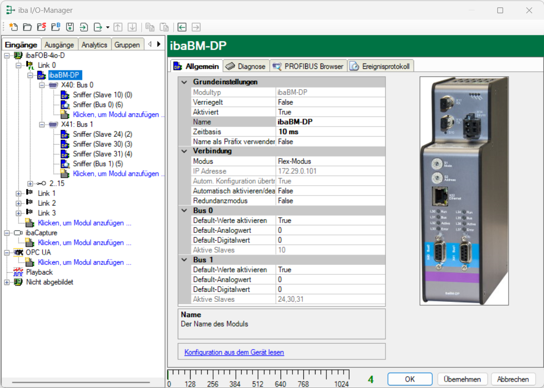 Der Vorteil des "ibaBM-DP"-Gerätemoduls liegt darin, dass für Bus0 und Bus1 jeweils eigene Knoten existieren. Für jeden Bus gibt es eigene Module, wie Sniffer, aktiver Slave, Dig512 Sniffer. Die Projektierung der Signale ist so übersichtlicher.