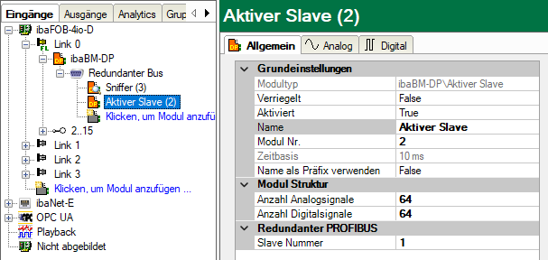 Im Redundanzmodus gibt es im Register Allgemein nur noch eine Gruppe "Redundanter PROFIBUS", in der Sie die Slave-Nummer einstellen. Es gibt keinen Eintrag mehr für die Auswahl der Busnummer, da der aktive Slave im Redundanzmodus immer auf beiden Bussen gleichzeitig erzeugt wird.