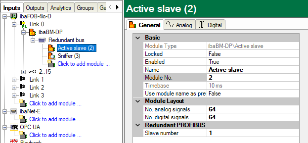In redundancy mode, there is only one group "Redundant Profibus" on the General tab where you can set the slave numbers. There is no entry any more for selecting the bus number, as the active slave in redundancy mode is always generated on both buses simultaneously.