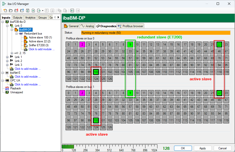 In the example below, by means of two modules of the "Active slave" type, slaves with the addresses 22 and 100 have been generated. If you take a look at the diagnostics you see that both slaves were generated on both bus systems (bold margin shows that this slave is assigned to the chosen ibaBM-DP device). Moreover, you can see an "external" slave, in this case an ET200 station with the address 9. The master with the address 2 (each a S7-400H CPU) is displayed on both bus systems in magenta.