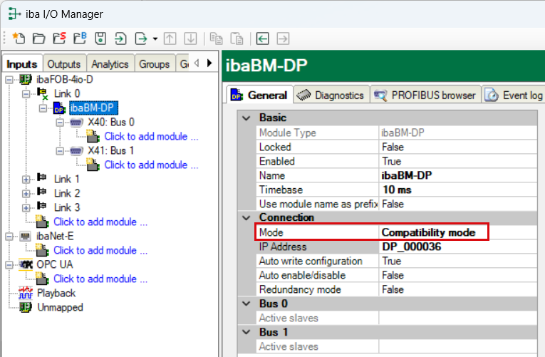 In compatibility mode 32Mbit, the device can be used with an “ibaBM-DP” device module in the ibaPDA configuration (I/O Manager). This mode is necessary when you want to connect an ibaBM-DP device to an ibaPDA system but cannot establish a bidirectional FO cable connection. One reason might be e. g. that you have only ibaFOB-D cards with inputs and outputs cannot be added anymore due to a lack of space.