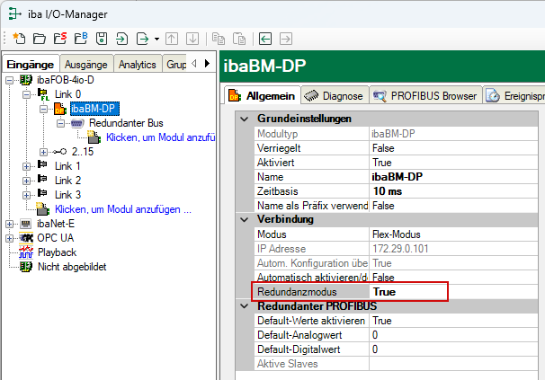 Im I/O-Manager fügen Sie an dem entsprechenden Link ein Gerätemodul "ibaBM-DP" ein.