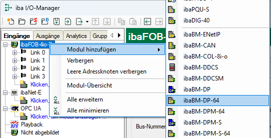 Alternativ können Sie das Modul "ibaBM-DP-64" auch manuell hinzufügen, indem Sie über das Kontextmenu Modul hinzufügen – ibaBM-DP-64 auswählen.