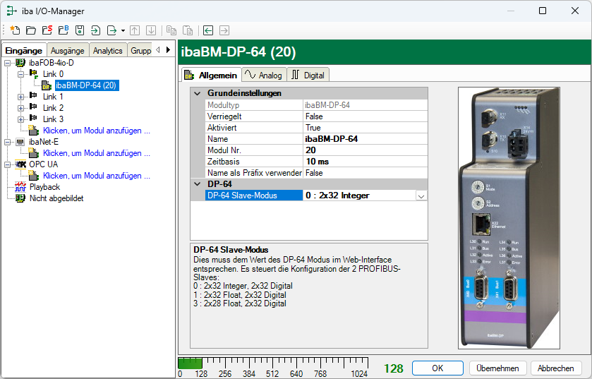 Das Gerät mit dem eingestellten Kompatibilitätsmodus 3Mbit (Drehschalter S1 = 0 und S2 = 0) wird automatisch erkannt und im Modulbaum als "ibaBM-DP-64" angezeigt.