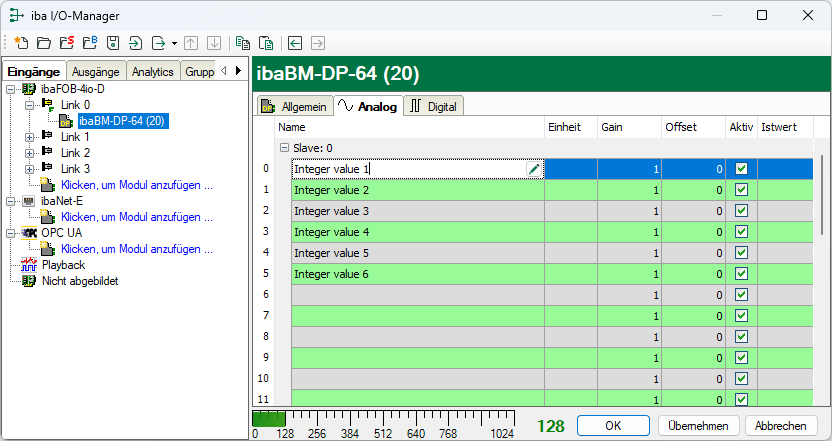 Tragen Sie im Register Analog der Reihe nach die Signale ein, die aufgezeichnet werden sollen.