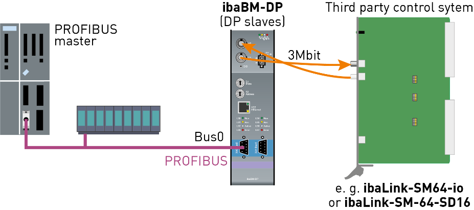 The data from the ibaNet 3Mbit interface are mirrored to 2 configurable PROFIBUS slaves. Thus, the data can be exchanged bidirectionally.