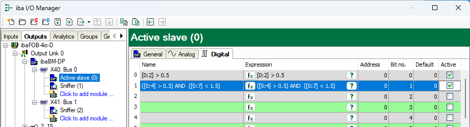 The procedure is identical to the procedure for the analog values. Additionally to the Address column, there is the Bit no. column where the bit address of the output signal is defined within the address byte.