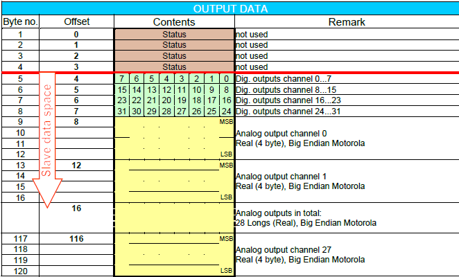 This mode is used to read up to 28 real values and 32 digital signals from the PROFIBUS (OUT 120 bytes) from a SIMATIC S7 as PROFIBUS master. Due to limitations of the S7 real data type only 28 values can be used.