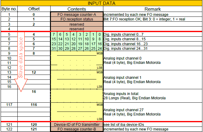 This mode is used to write up to 28 real values and 32 digital signals to a SIMATIC S7 (resp. TDC, SD) as PROFIBUS master. Due to limitations of the SIMATIC real data type only 28 values can be used (IN 122 bytes/OUT 4 bytes).