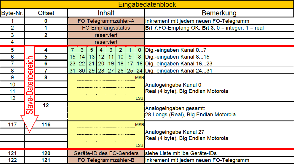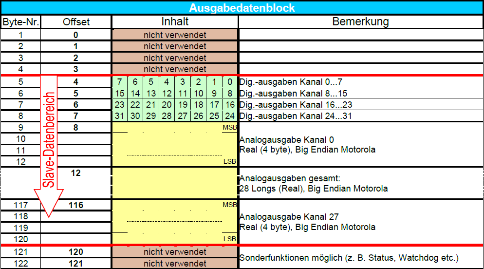 Dieser Modus dient zum Lesen und Schreiben von bis zu 28 Real-Werten und 32 Digitalsignalen am PROFIBUS mit einer SIMATIC S7 (bzw. TDC, SD) als PROFIBUS-Master. Aufgrund der Beschränkung des S7-Real-Datentyps können nur 28 Werte übertragen werden (IN 122 Bytes/OUT 122 Bytes).