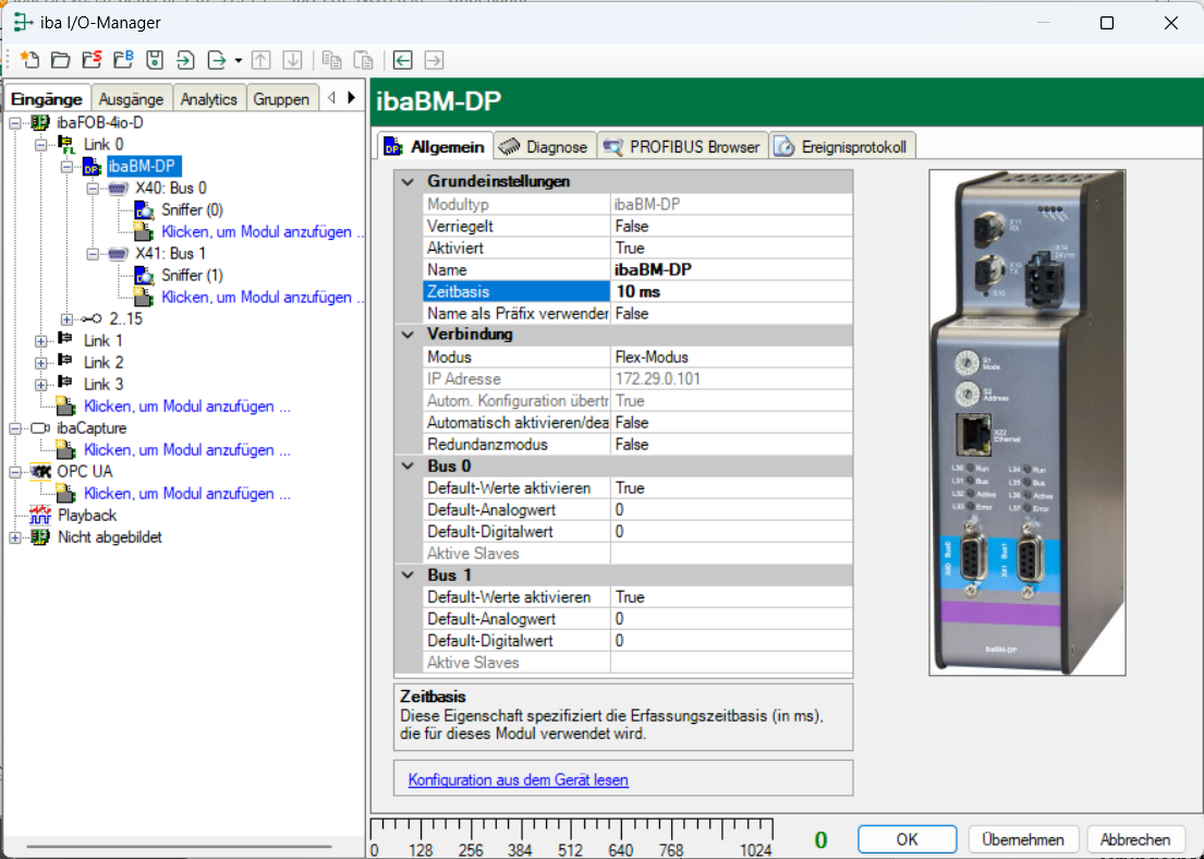 Im Register Allgemein nehmen Sie die Grundeinstellungen, die Verbindungseinstellungen und Default-Einstellungen für das Gerätemodul "ibaBM-DP" vor.