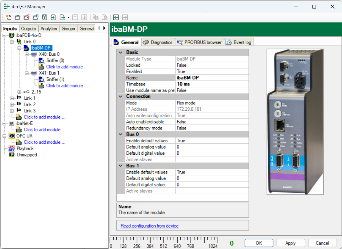 In the General tab, make the basic settings, advanced settings and connection settings for the "ibaBM-DP" device module.