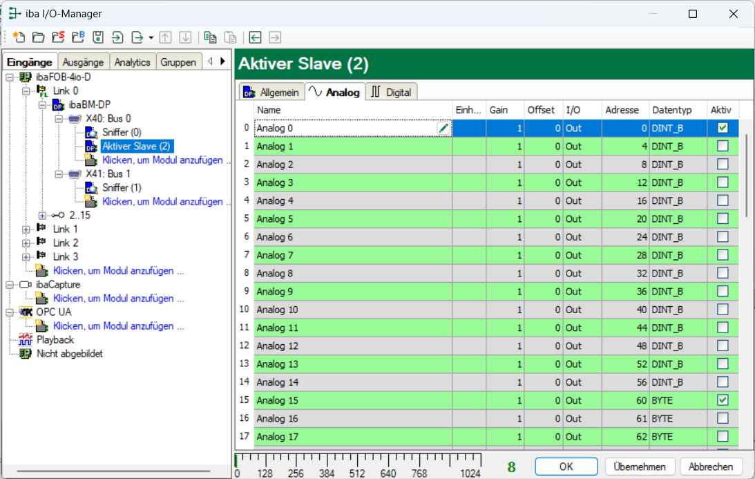Im Register Analog tragen Sie für das Modul "Aktiver Slave" der Reihe nach die Analogsignale ein, die aufgezeichnet werden sollen.