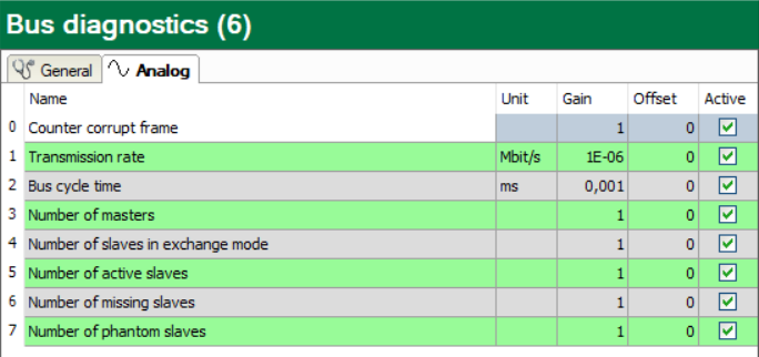 The Analog tab contains a series of predefined diagnostic values for the "Bus diagnostics" module: