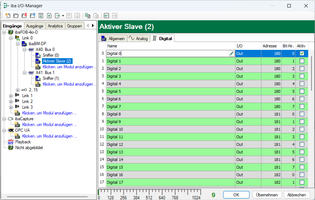 Im Register Digital tragen Sie für das Modul "Aktiver Slave" der Reihe nach Digitalsignale ein, die aufgezeichnet werden sollen.