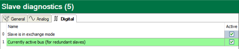 If redundancy mode is activated, the bus currently active for the diagnosed slave is displayed here (0: bus 0, 1: bus 1). For further information on the redundancy mode, see chapter Redundancy mode.