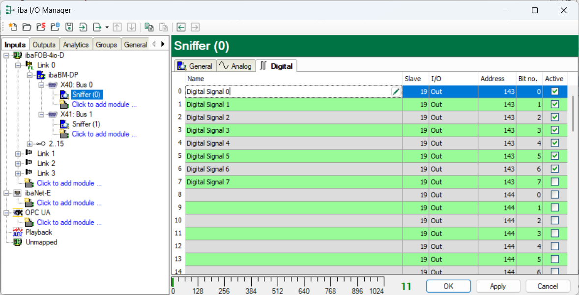 In the Digital tab, enter the digital signals to be acquired for the "Sniffer" module one after the other.