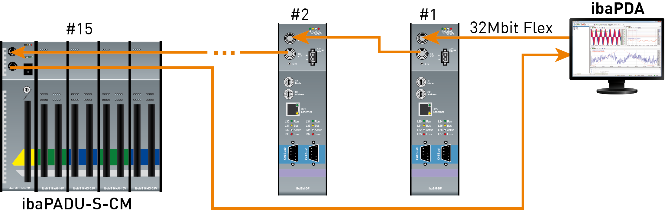 Aufgrund der großen Datenmengen, die üblicherweise mit ibaBM-DP erfasst werden, ist es meistens sinnvoll, nur ein einziges Gerät an einem 32Mbit Flex-Link zu betreiben, siehe Kapitel Datenerfassung 32Mbit Flex. |