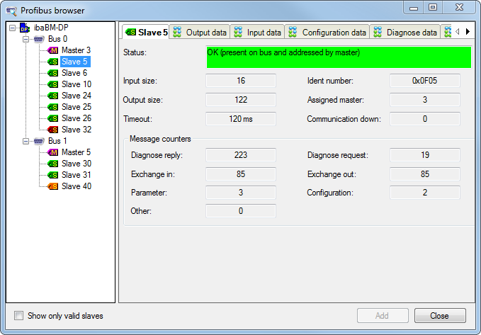 If a slave has input and/or output data, (e. g. ET200 station with input and/or output signals), the data are shown on two tabs, the Output data and the Input data tab. You can interpret the binary data by means of the Hex viewer.